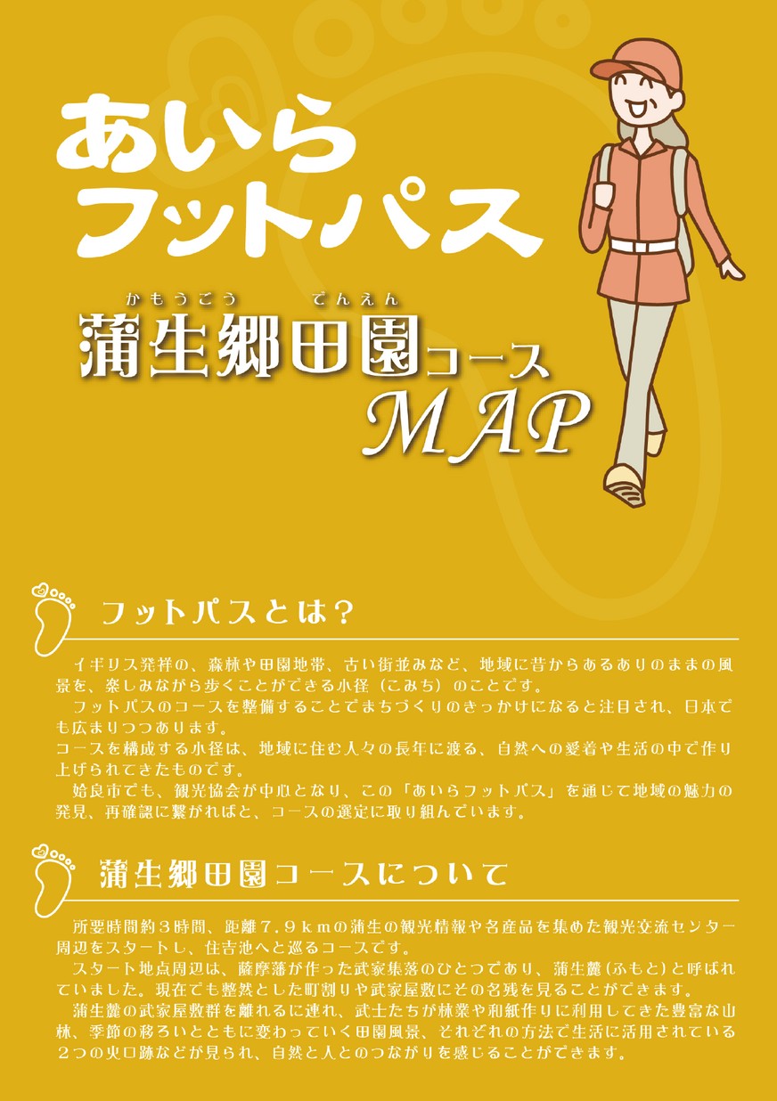 あいらフットパス 蒲生郷田園コースMAP 森林や田園地帯、古い街並みなど、地域に昔からあるありのままの風景を楽しみながら歩くことができる小径(こみち)を“フットパス”と言います 【タグ】あいらフットパス, 【カテゴリ】姶良市 【掲載日】2014-09-30 【ページ数】4 【発行元】姶良市 秘書広報課 >電子ブックを開く(HTML5版) ツイート