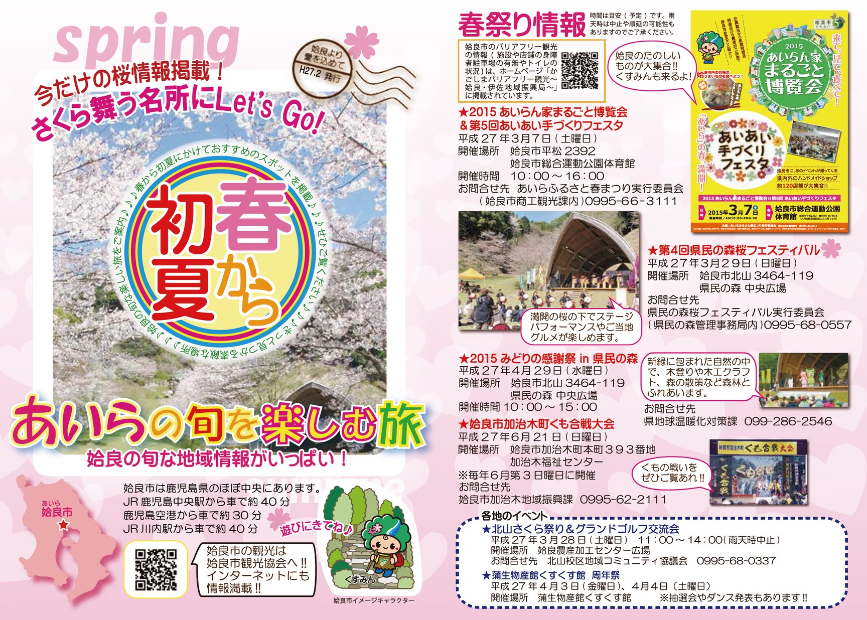 あいらの旬を楽しむ旅 2015春~初夏編 姶良の旬な楽しい旅を季節ごとのおすすめスポットをご案内。イベントのほか、温泉・宿泊情報、各地のスポット・お店情報を掲載しています。 【タグ】観光, 【カテゴリ】姶良市 【掲載日】2015-03-13 【ページ数】4 【発行元】姶良市観光協会 >電子ブックを開く(HTML5版) ツイート バックナンバー あいらの旬を楽し...2014秋~初冬編 あいらの旬を楽し...2014夏~初秋編