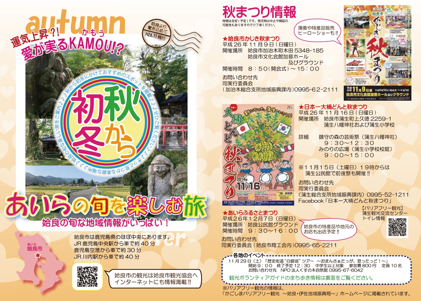 あいらの旬を楽しむ旅 2014秋~初冬編 姶良の旬な楽しい旅を季節ごとのおすすめスポットをご案内。イベントのほか、温泉・宿泊情報、各地のスポット・お店情報を掲載しています。 【タグ】観光, 【カテゴリ】姶良市 【掲載日】2015-03-13 【ページ数】4 【発行元】姶良市観光協会 >電子ブックを開く(HTML5版) ツイート バックナンバー あいらの旬を楽し...2015春~初夏編 あいらの旬を楽し...2014夏~初秋編