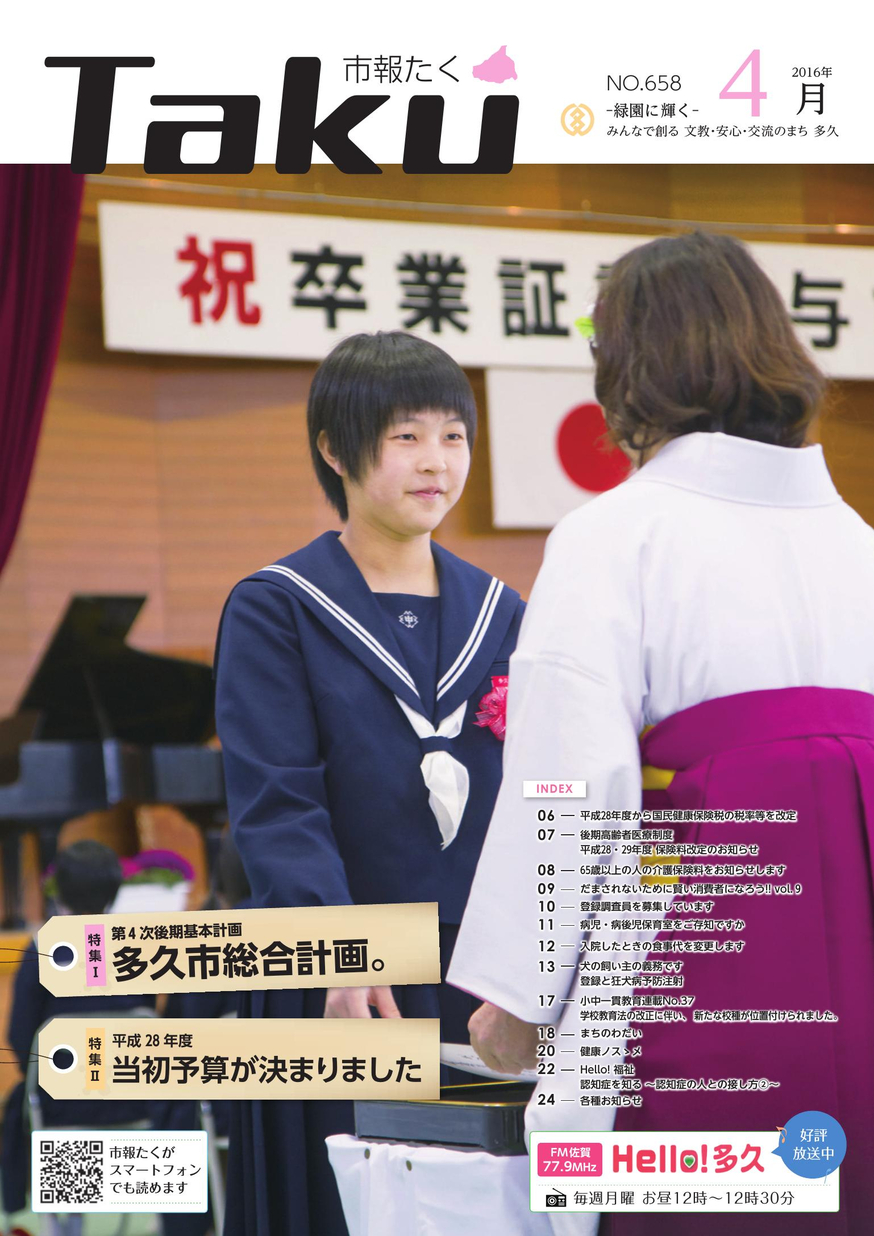 市報多久 平成28年4月号 紙媒体8000部/月発行。28ページ。月1回発行 【タグ】広報誌, 【カテゴリ】多久市 【掲載日】2016-04-06 【ページ数】28 【発行元】多久市 総務課 >電子ブックを開く(HTML5版) ツイート バックナンバー 市報多久平成29年3月号 市報多久平成29年2月号 市報多久平成29年1月号 市報多久平成28年12月号 市報多久平成28年11月号 市報多久平成28年10月号 市報多久平成28年9月号 市報多久平成28年8月号 市報多久平成28年7月号 市報多久平成28年6月号 市報多久平成28年5月号