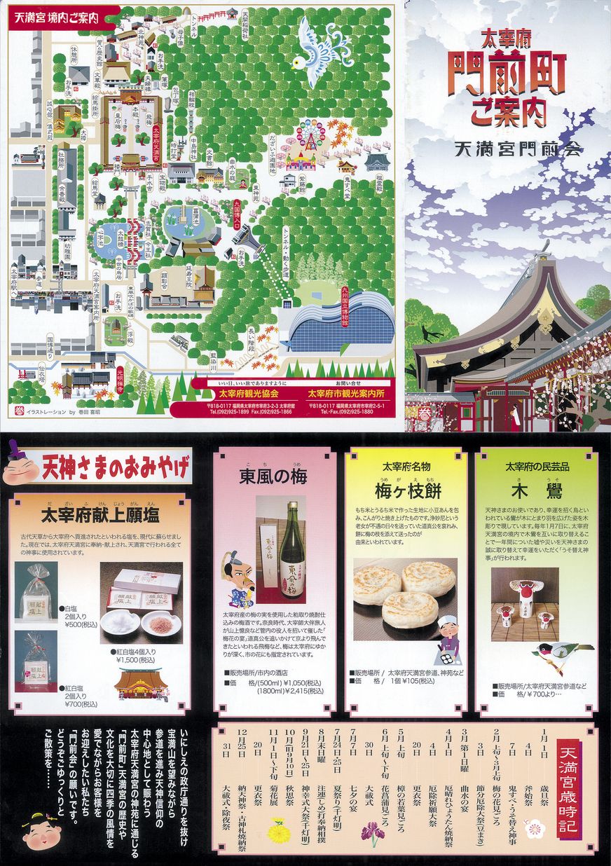 太宰府門前町の店舗名と電話番号、太宰府天満宮の境内マップ、周辺マップがイラストで付いたハンディーなリーフレット。