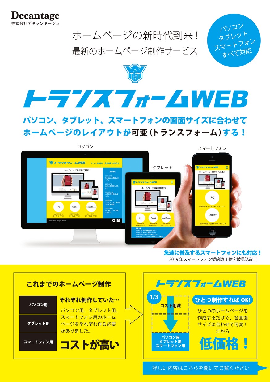 1つのホームページがパソコン、タブレット、スマートフォンそれぞれの画面で見やすく変形する新たなホームページ制作サービス!短納期で低価格のホームページ制作サービスです。